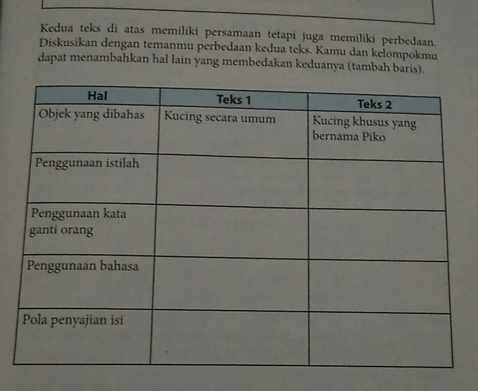 Berikut ini perbedaan teks eksplanasi dan teks eksposisi:. Teks eksplanasi adalah karangan yang … Teks laporan menggambarkan sesuatu secara umum dan sesuai fakta apa adanya tanpa ada opini/pendapat penulis. Persamaan teks laporan hasil observasi dan teks deskripsi ada … Menurut mark and katty anderson dalam text types in english (2003), teks eksplanasi adalah bentuk teks yang menyajikan serangkaian peristiwa. Teks deskripsi adalah teks yang berisi pemaparan atau penggambaran atas suatu obyek dengan detail. 24.06.2021 · perbedaan teks laporan dengan teks deskripsi. Pengertian tentang suatu objek b. Pada umumnya teks laporan hasil observasi memiliki bentuk yang hampir sama dengan teks deskripsi, tetapi sebenarnya sifat kedua teks tersebut berbeda. Salah satu unsur kebahasaan teks laporan adalah adanya penggunaan kalimat definisi dan kalimat deskripsi. 19.11.2020 · teks akademik dalam genre makro dapat berwujud dalam berbagai jenis, misalnya ulasan buku, proposal penelitian, laporan penelitian, laporan praktikum, dan artikel ilmiah. Teks laporan hasil observasi adalah suatu teks yang berfungsi untuk menjelaskan informasi tentang suatu objek yang telah diamati. Deskripsi mengenai pendapat yang diberikan mengenai suatu permasalahan.